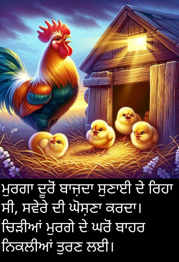 ਮੁਰਗਾ ਦੂਰੋਂ ਬਾਜ਼ਦਾ ਸੁਣਾਈ ਦੇ ਰਿਹਾ ਸੀ, ਸਵੇਰੇ ਦੀ ਘੋਸ਼ਣਾ ਕਰਦਾ। ਚਿੜੀਆਂ ਮੁਰਗੇ ਦੇ ਘਰੋਂ ਬਾਹਰ ਨਿਕਲੀਆਂ ਤੁਰਣ ਲਈ।